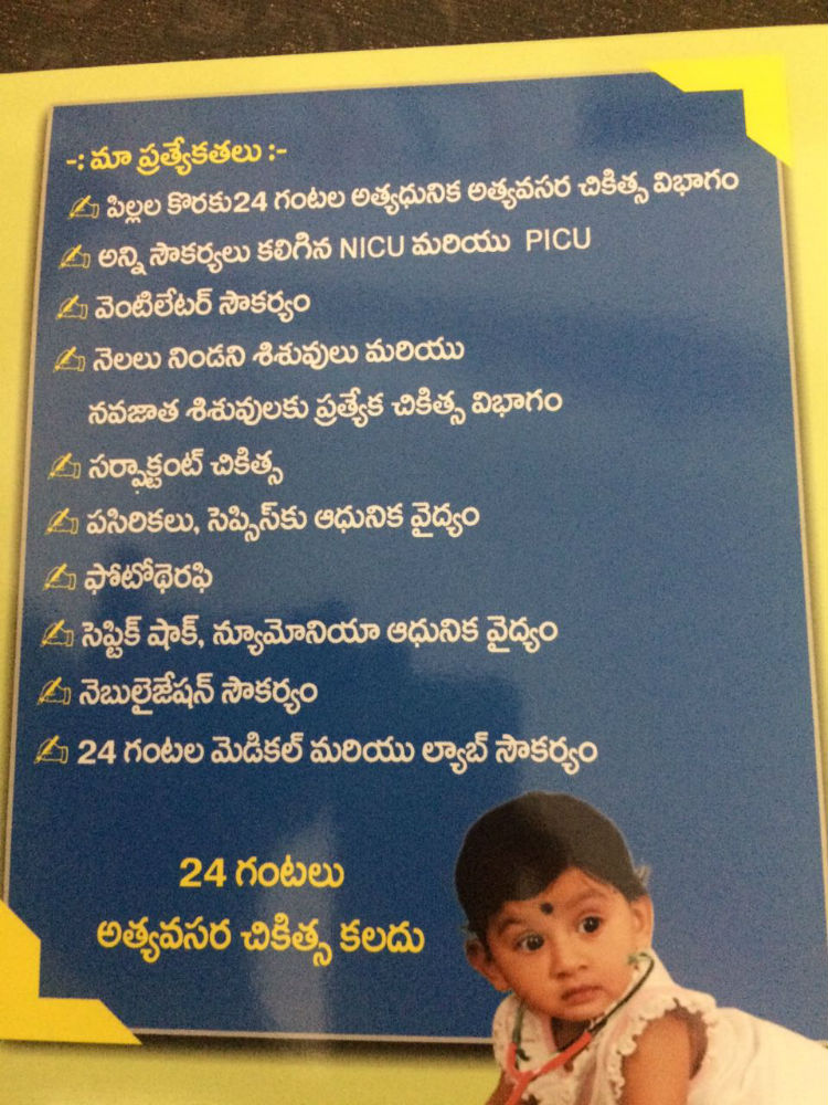 * పిల్లల కొరకు 24గంటల అత్యధునిక అత్యవసర చికిత్స విభాగం